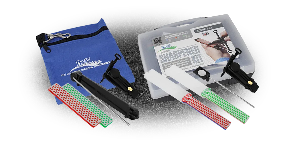 Perfekte Schärfe leicht gemacht - das DMT® Aligner™ Schleifsystem! Das System mit geführtem Schleifwinkel bringt professionelle Schleifergebnisse direkt in Ihre Hände, unabhängig von Ihrer Erfahrung. Mit 4" Diamond Whetstones™ in verschiedenen Schleifgraden und einer einzigartigen, patentierten Klingenführung mit sieben einstellbaren Winkeln sorgt das Aligner™ Set für präzises und gleichmäßiges Schleifen bei jeder Anwendung.
